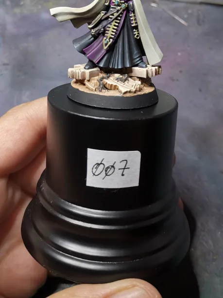 Sur les concours en format Open, il est fréquent que l’organisation vous demande de coller une étiquette sur votre pièce afin d’identifier le propriétaire de la figurine, elle présente souvent votre numéro d’enregistrement. Cette étiquette, à fixer sur le socle, peut être problématique car elle peut se coller au flocage ou tout autre élément dépassant de ce dernier ce qui pourrait abimer votre figurine.